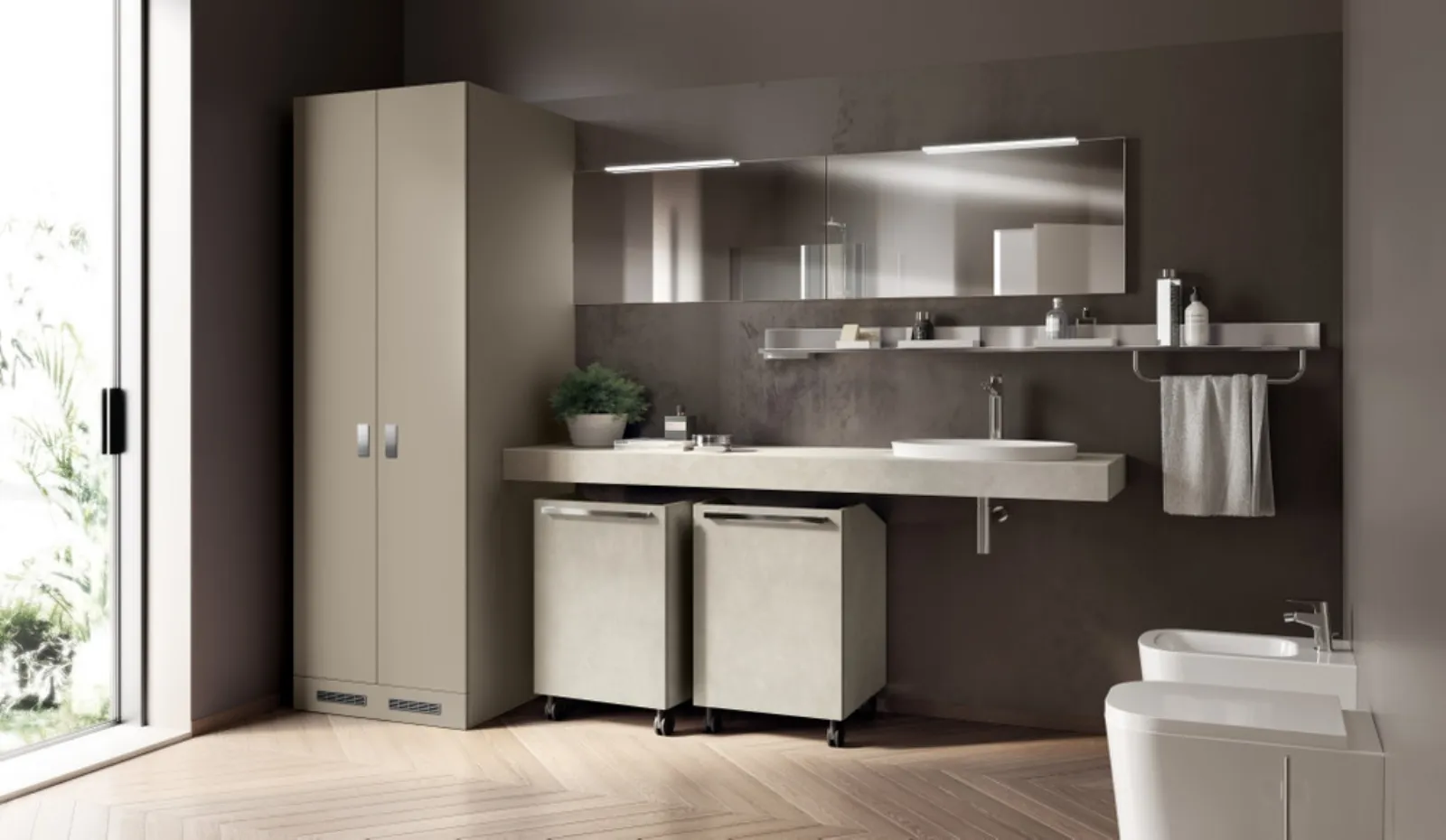 The proposals of the renowned brand are always made of excellent materials, capable of withstanding the test of time against moisture and cleaning agents. Modern Bathroom Furnishings from the most well-known brands today offer modular elements to create highly-designed and well-equipped environments. The model of Laundry Space Aquo Visone Bathroom Cabinet by Scavolini Bathrooms in matte lacquer perfects the room by seamlessly combining qualities of elegance with ergonomics and safety. In our store, you will have access to various Scavolini Bathrooms compositions to furnish the area of the house dedicated to personal care routine. In the showroom you will find not only bathroom fixtures, but also all the other accessories included in the concept for the bathroom: discover the most exclusive proposals of bathroom furniture for laundry.