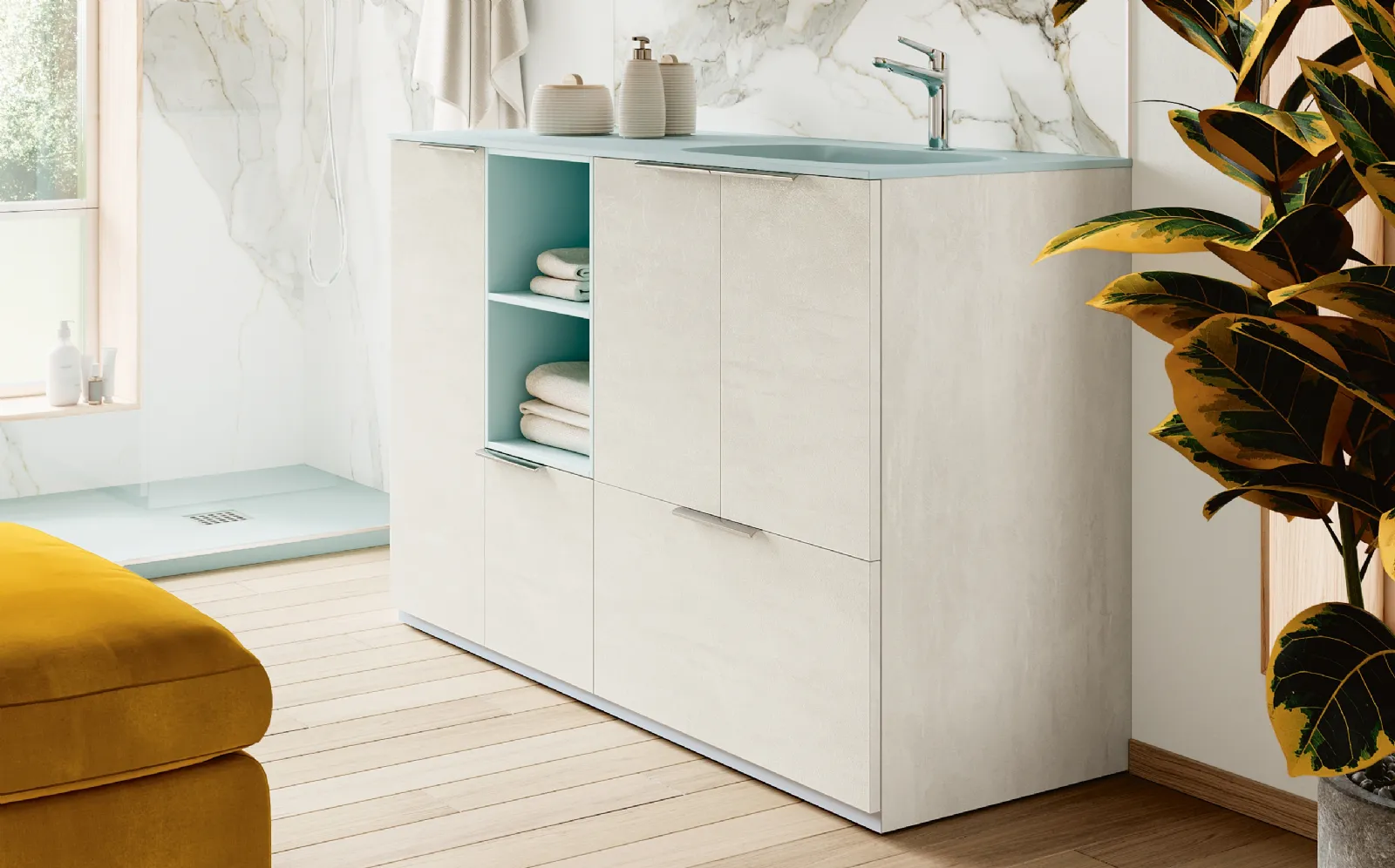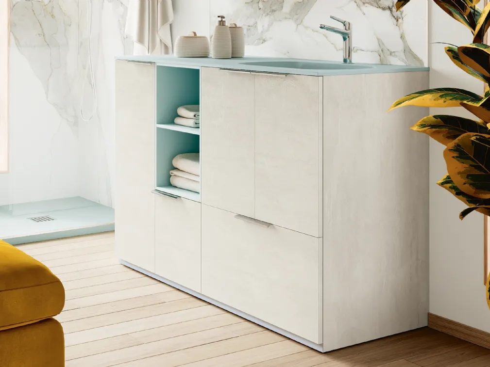 Furnish your modern bathroom at its best with Thai 403, floor-mounted bathroom furniture and melamine accessories by Rab Arredobagno.