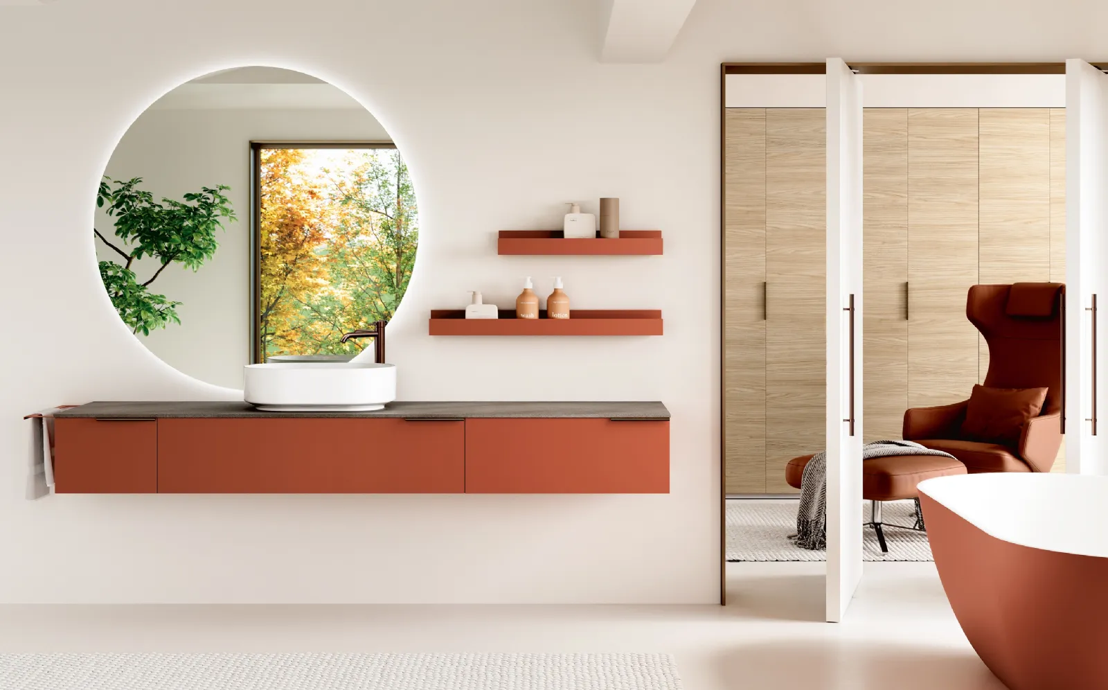 Suspended Bathroom Unit Thai 406 by Rab Arredobagno: click and get information on suspended bathroom units in matte lacquer and accessory elements from the brand.