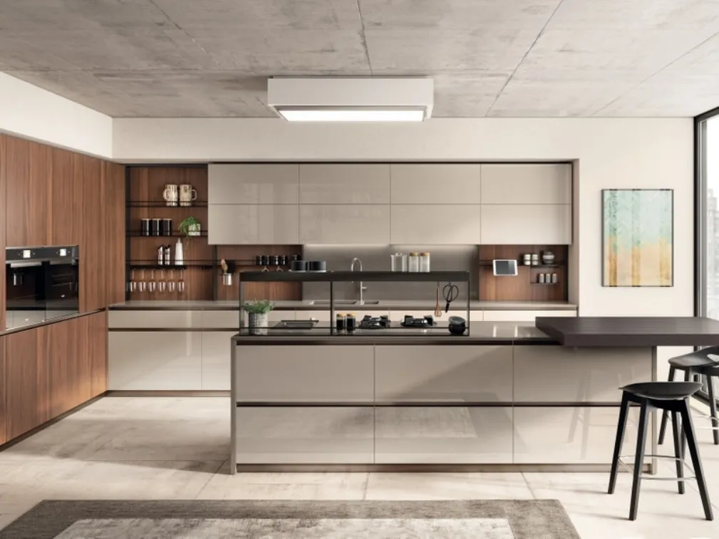 The bespoke Boxi 02 Mink and Walnut Sunset Kitchen by Scavolini is designed for those who live in their living spaces in an operational and practical way but do not want to give up design and aesthetic content. Our proposals in glossy lacquer allow you to manage your living spaces feeling always welcomed and comfortable, relying on high-quality and long-lasting materials. If you cannot give up the unique lines of Custom Kitchens with an island, come to the store: we are retailers of the Scavolini brand and our designers are waiting for you to guide you towards the model that suits you best.