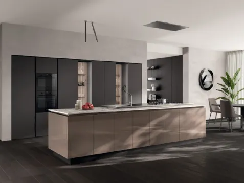 Modern kitchens with island: click and discover a rich catalog of solutions from the Scavolini brand, including the Mia model in Dark Steel and Biomalta Clay Dehli.
